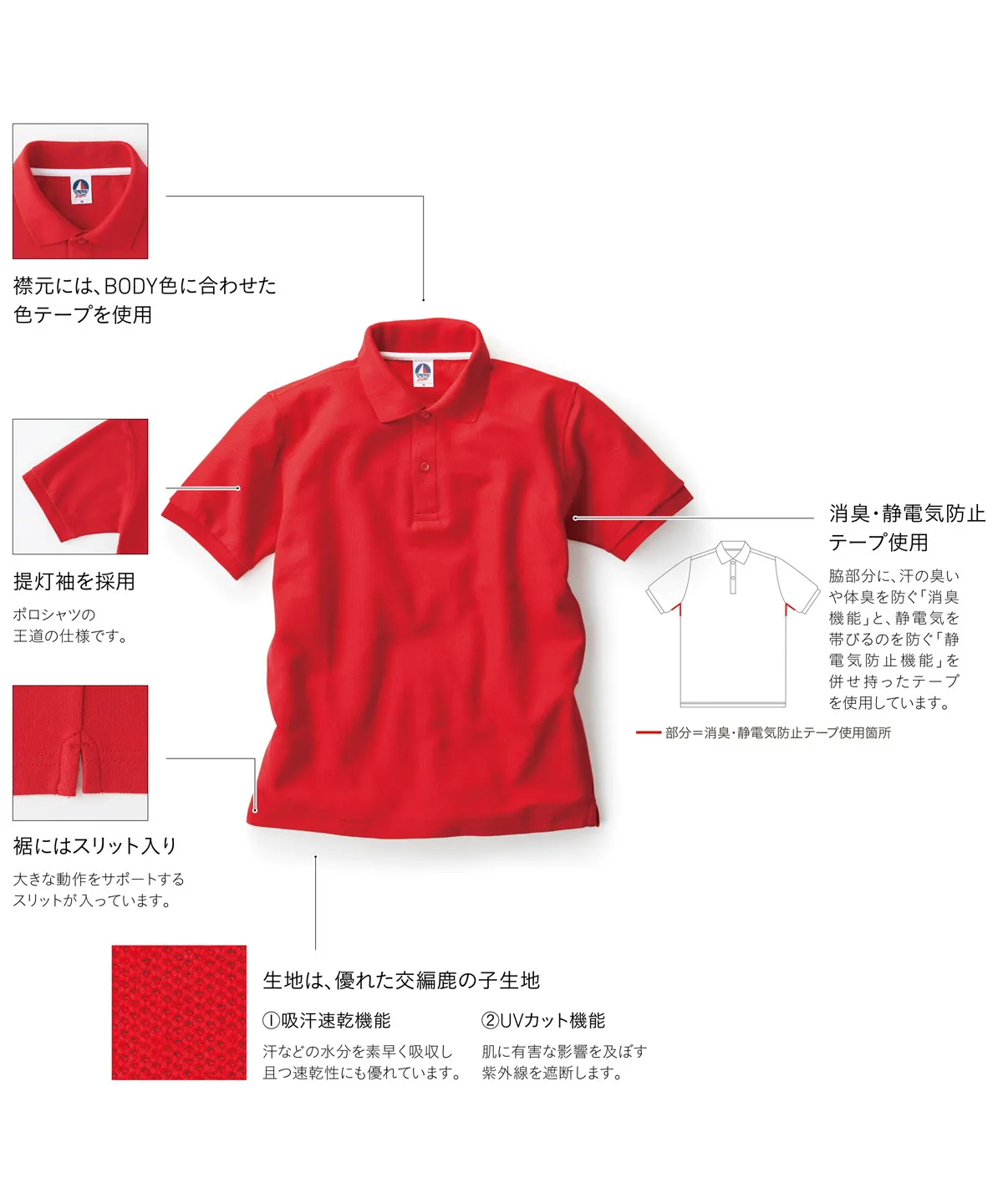 脇部分に、汗の臭いや体臭を防ぐ「消臭機能」と、静電気を帯びるのを防ぐ「静電気防止機能」を併せ持ったテープを使用しています。