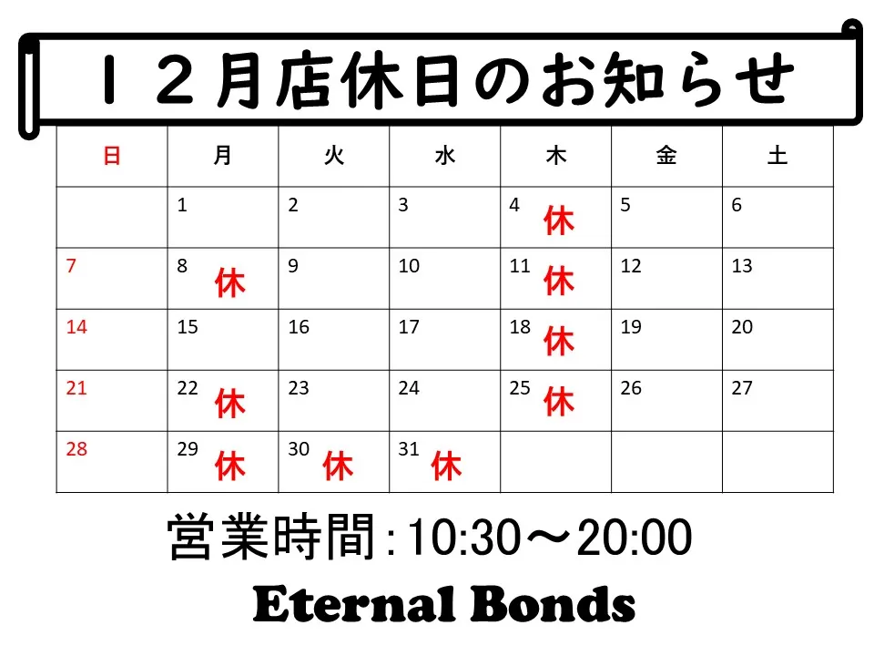 【お知らせ】2025年12月の店休日について