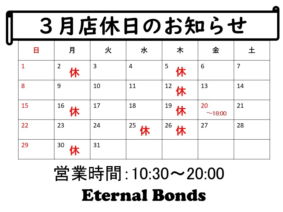 2026年3月の店休日についてお知らせ致します。